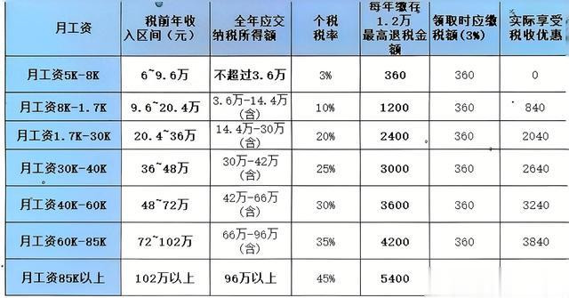 个东说念主待业金,便是个东说念主为我方储备的待业金,是社珍爱老和作事(企业)年金的补充,天然目下开户由7000万东说念主,然则的确存入资金账户的很少,年青东说念主开户意愿不高,刻下个东说念主待业金资金投资收益暂不收个东说念主所得税,退休领取时再收取3%,目下5000-8000月工资,个税税率3%,退休时扣3%,意味着这个工资区间的东说念主投保莫得取得内容税优,月工资8000-17000区间,个税税率10%,退休扣3%,意味着取得7%的真实优惠,12000x7%=840元;年收入百万最多每年真实抵税5040元,收入越高取得真实优惠越大。