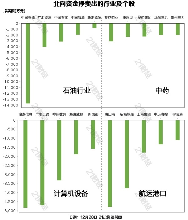 北向资金减握了19个行业,其中石油行业最多,净卖出金额达2.47亿元,其次是中药行业,净卖出2.28亿元。